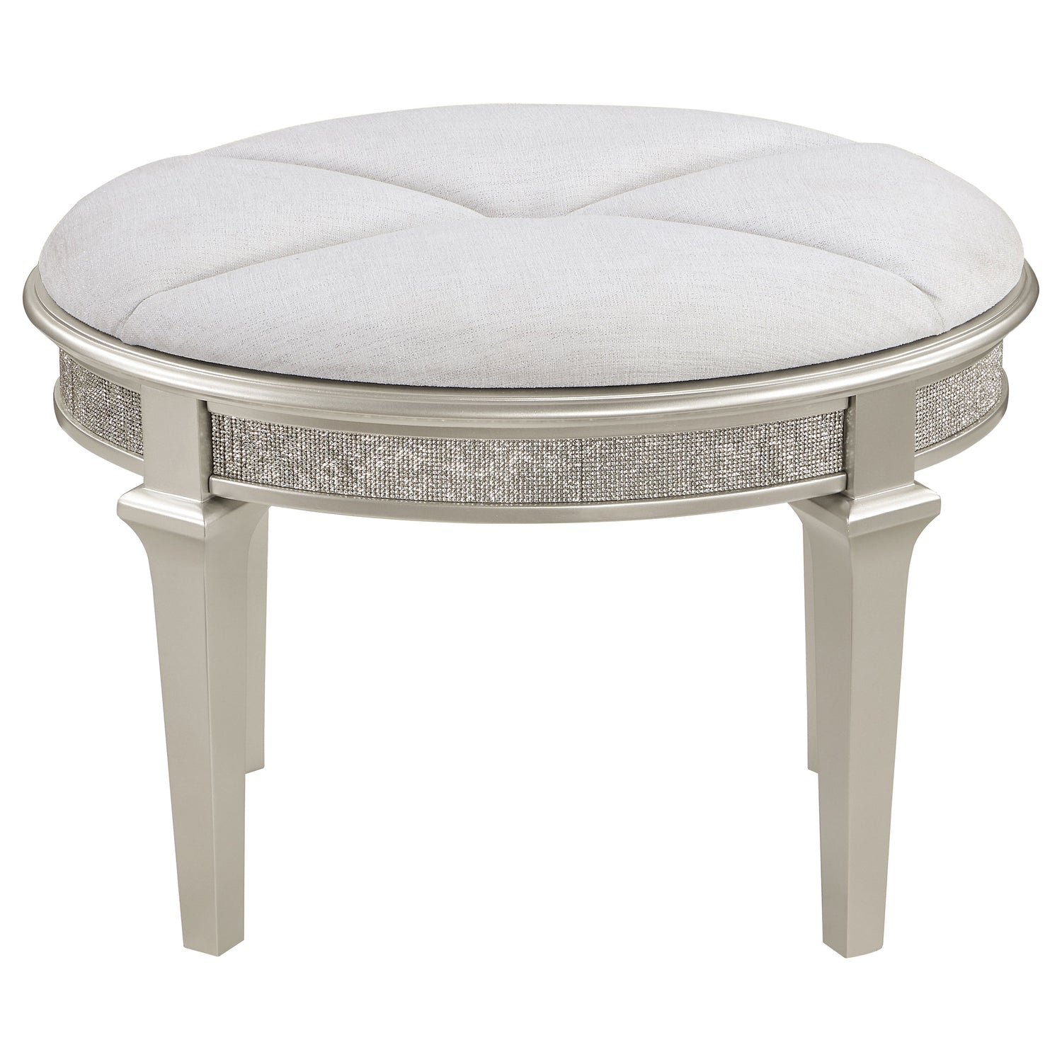 - Sleek stool with padded ivory chenille seat and elegant trim, designed to tuck under the desk for space efficiency