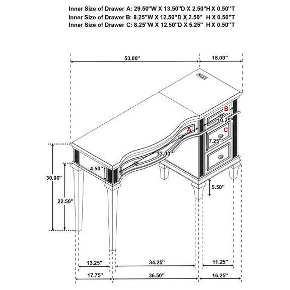 - Vanity desk with four drawers and felt-lined top compartment for organized, protected storage
