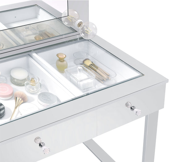 - Vanity table features a clear tempered glass top and three drawers allowing you to showcase your accessories